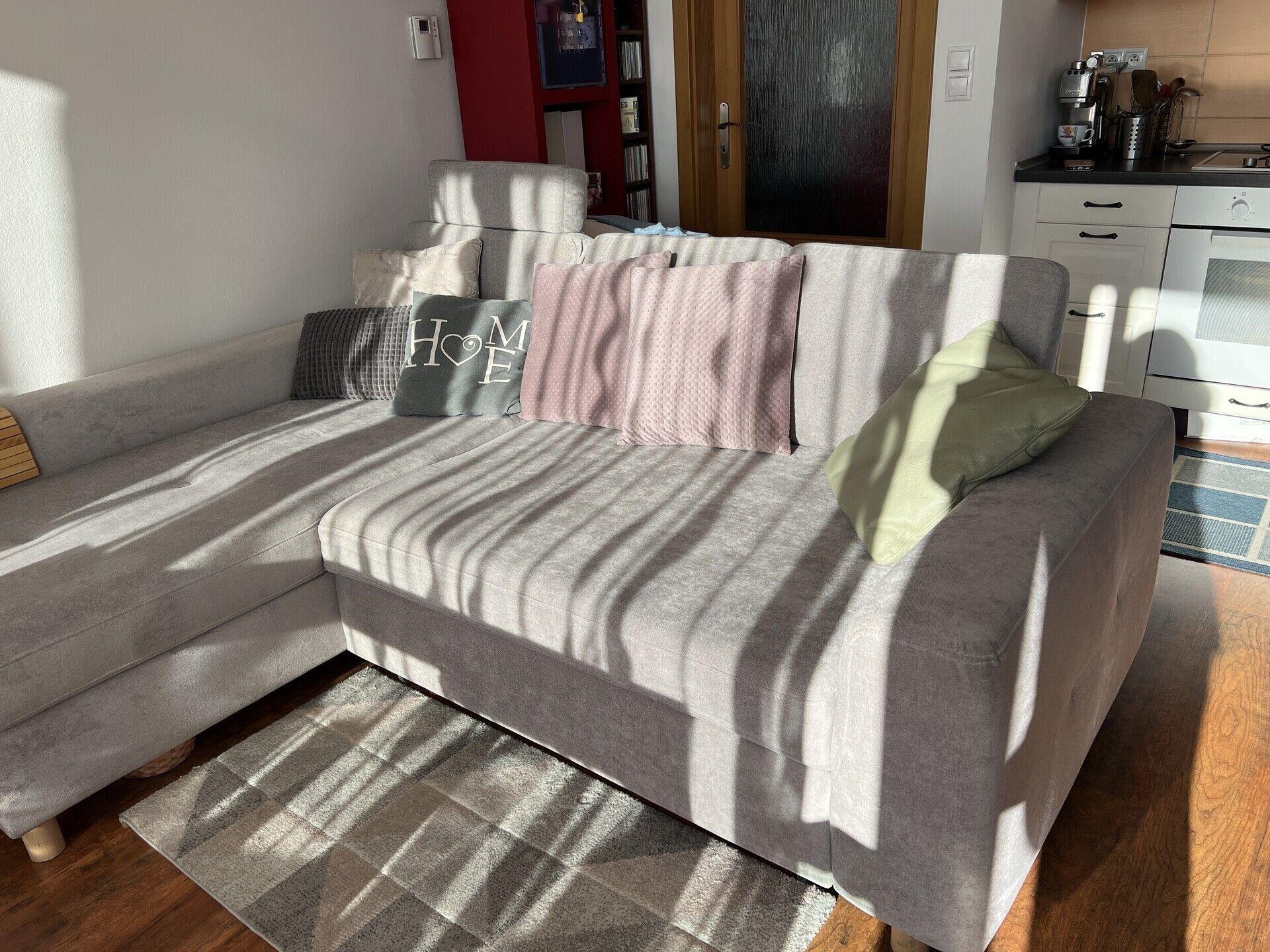 Srdce bytu: Velkorysý obývací pokoj s kuchyňským koutem, kde najdete linku ve tvaru L se sporákem, varnou deskou, digestoří a lednicí.